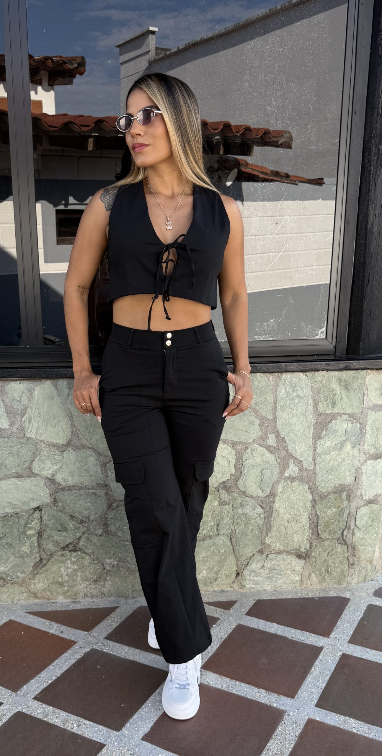 Hermoso set de pantalón negro con chaleco de amarrar